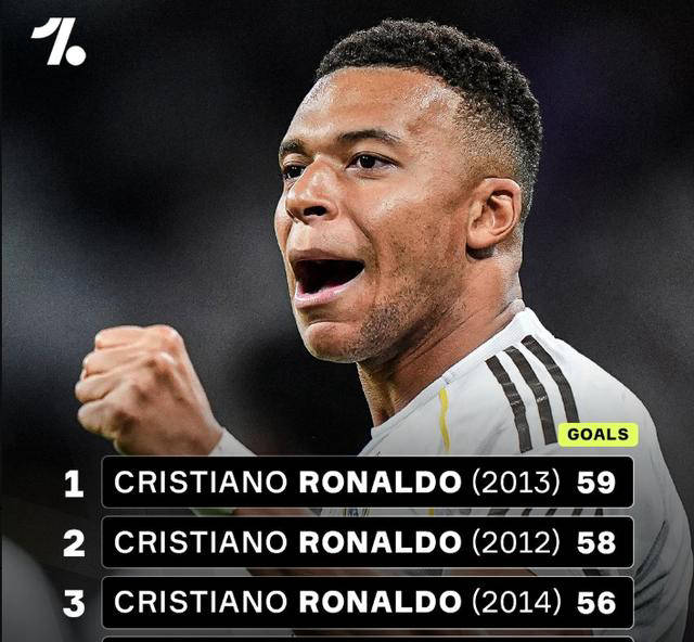 本年度姆巴佩堪称皇马进攻利器,55场轰进55球,年内总进球数已达55粒,排在俱乐部历史第4位。前三名均由C罗占据,分别为2013年59球、2012年58球、以及2014年56球。只需再添1球,姆巴佩便能追平2014年C罗的纪录,跻身皇马年度射手榜前三,书写属于自己的传奇篇章。